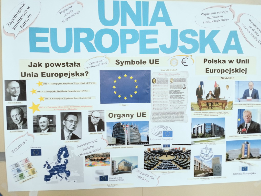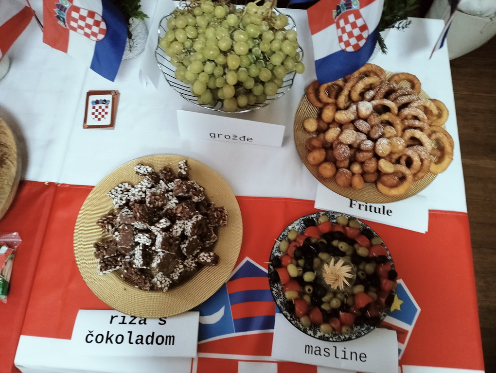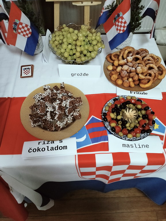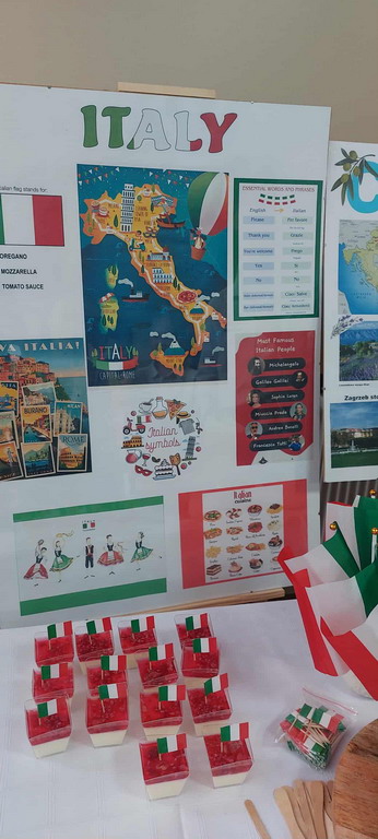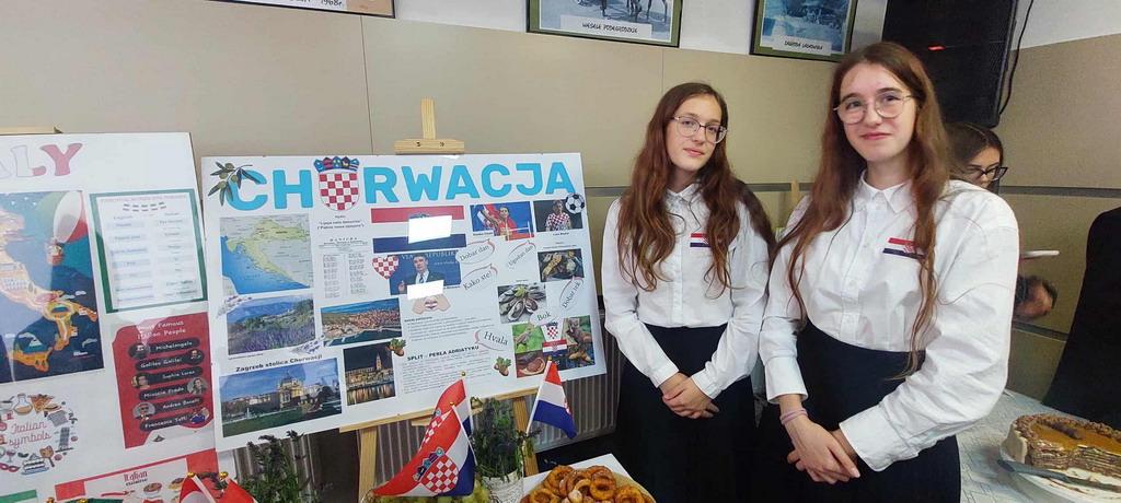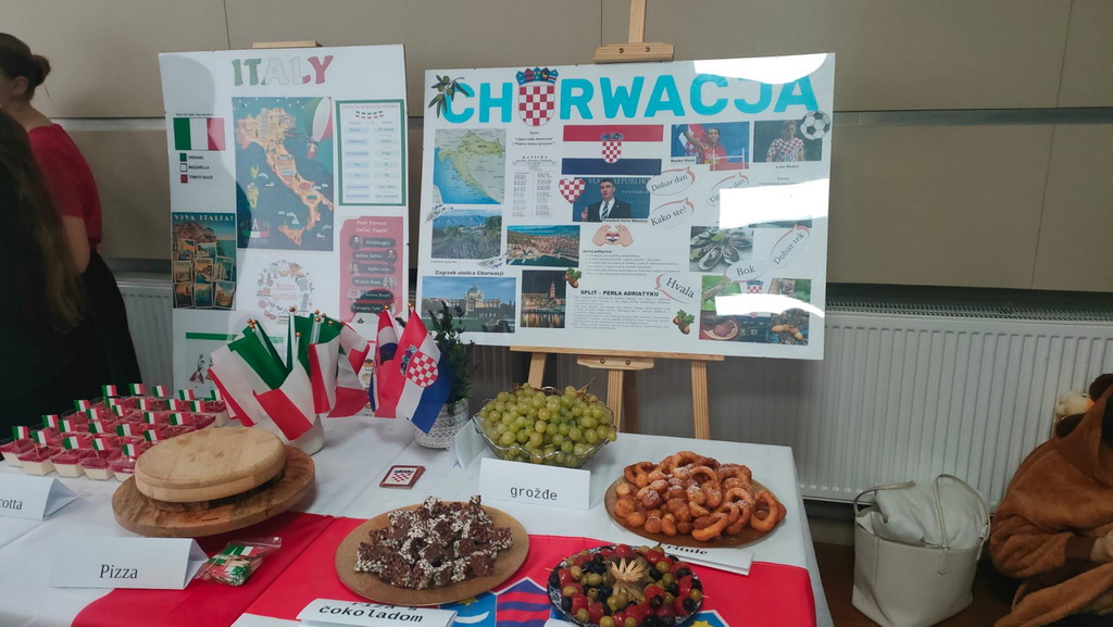 Podczas przerwy uczniowie wraz z wychowawcami przygotowali stoiska tematyczne poświęcone wybranym krajom - z plakatami, quizami i pysznymi przekąskami. Nie zabrakło włoskiej pizzy, panna cotty, a także chorwackich frituli, faworków kroštuli, ryżu w czekoladzie, oliwek i winogron. Wszystko smakowało wyśmienicie! Ponadto klasa VIII wraz z nauczycielem WOSu przygotowała plakat na temat Unii Europejskiej.