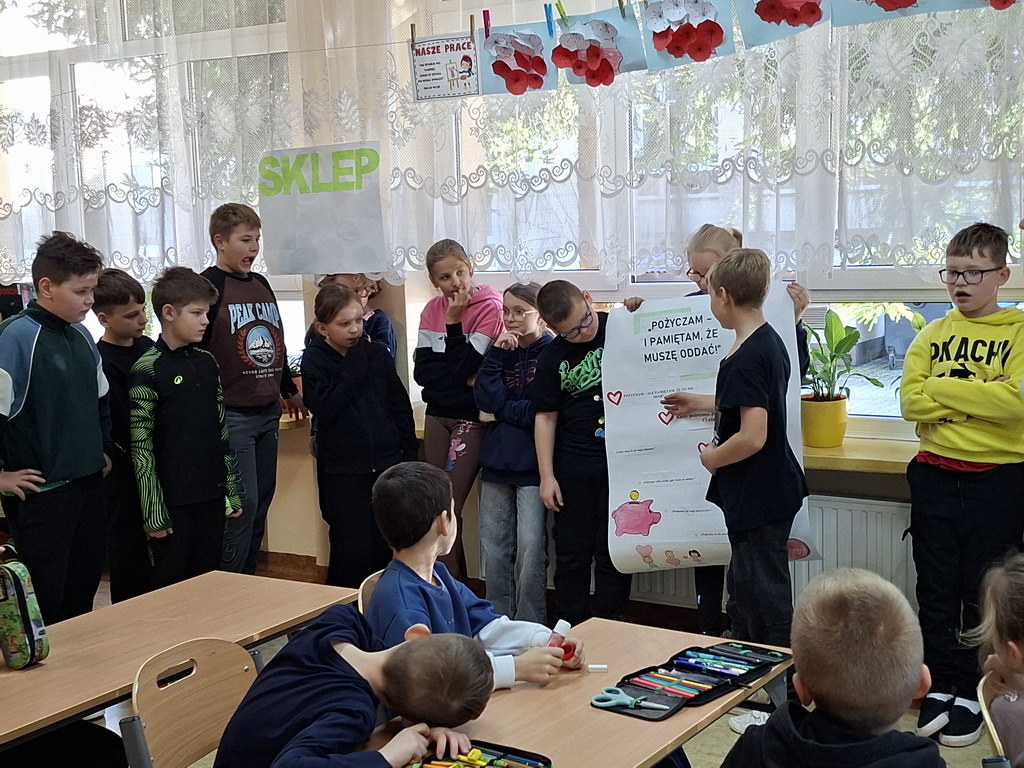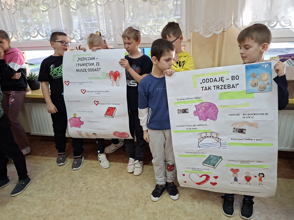 W kolejnej części zajęć poruszono temat pożyczania pieniędzy. Uczniowie poznali różnicę między pożyczaniem a dostawaniem, a także między pożyczaniem komuś a pożyczaniem od kogoś. Zrozumieli, że każdą pożyczoną kwotę należy zwrócić. Rozmawiali również o sytuacjach, kiedy warto pożyczać pieniądze, oraz poznali instytucje udzielające pożyczek, m.in. banki. Zdefiniowali pojęcia pożyczka i kredyt. Na zakończenie cyklu wykonali kolejne plakaty podsumowujące zdobytą wiedzę.