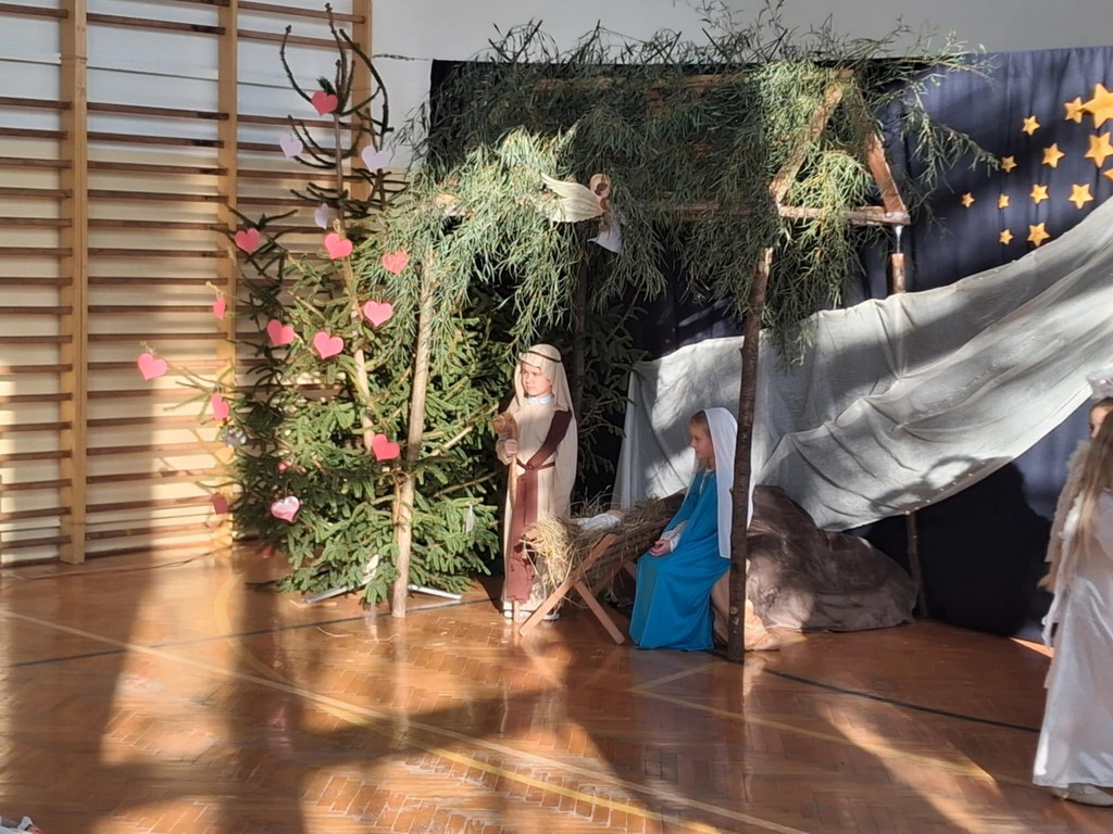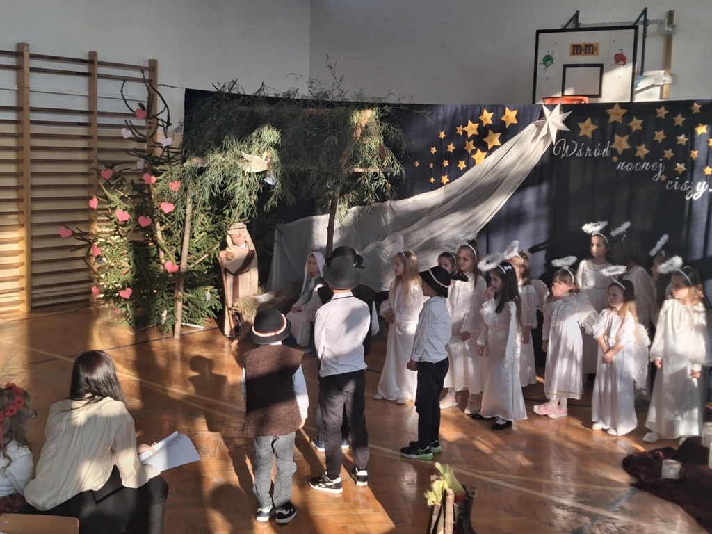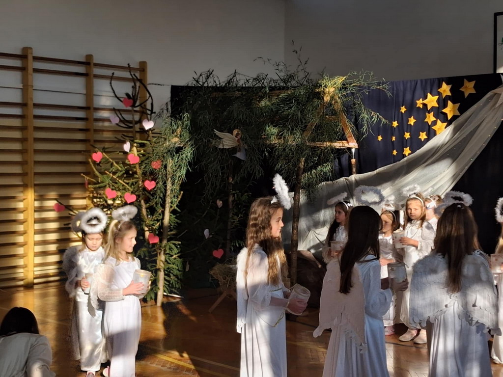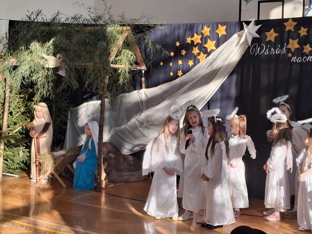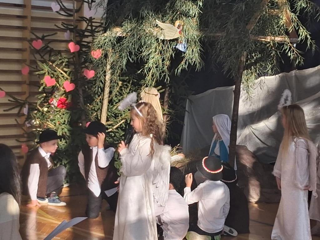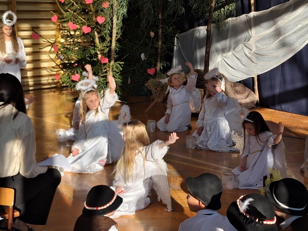 W dniu 19.12.2025r. w naszej szkole odbyła się uroczysta wigilia szkolna, pełna wzruszeń, radości i świątecznego ciepła. Dzieci z oddziału przedszkolnego oraz uczniowie klasy I przygotowali piękne przedstawienie bożonarodzeniowe, które wprowadziło wszystkich w magiczny, świąteczny nastrój. Po akademii wysłuchaliśmy koncertu kolęd w wykonaniu uczniów naszej szkoły, a następnie nadszedł wyjątkowy moment dzielenia się opłatkiem i składania życzeń.