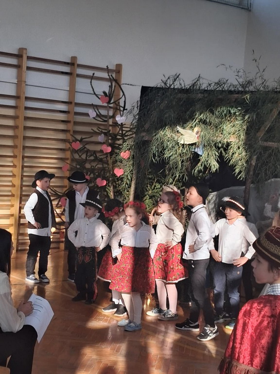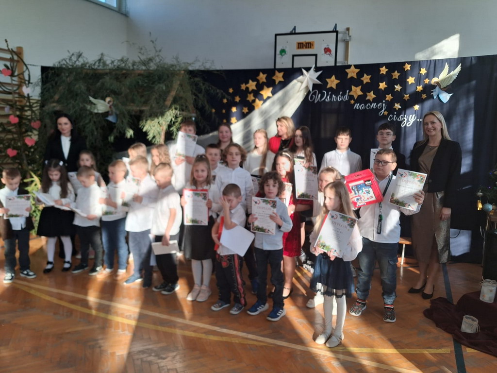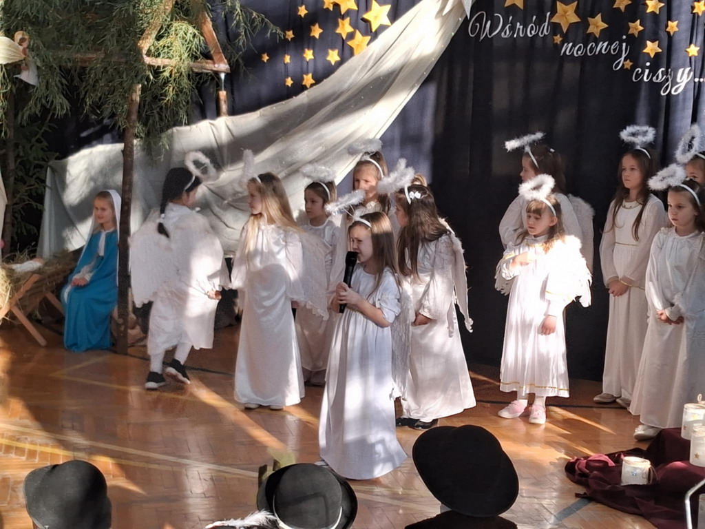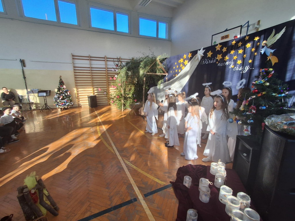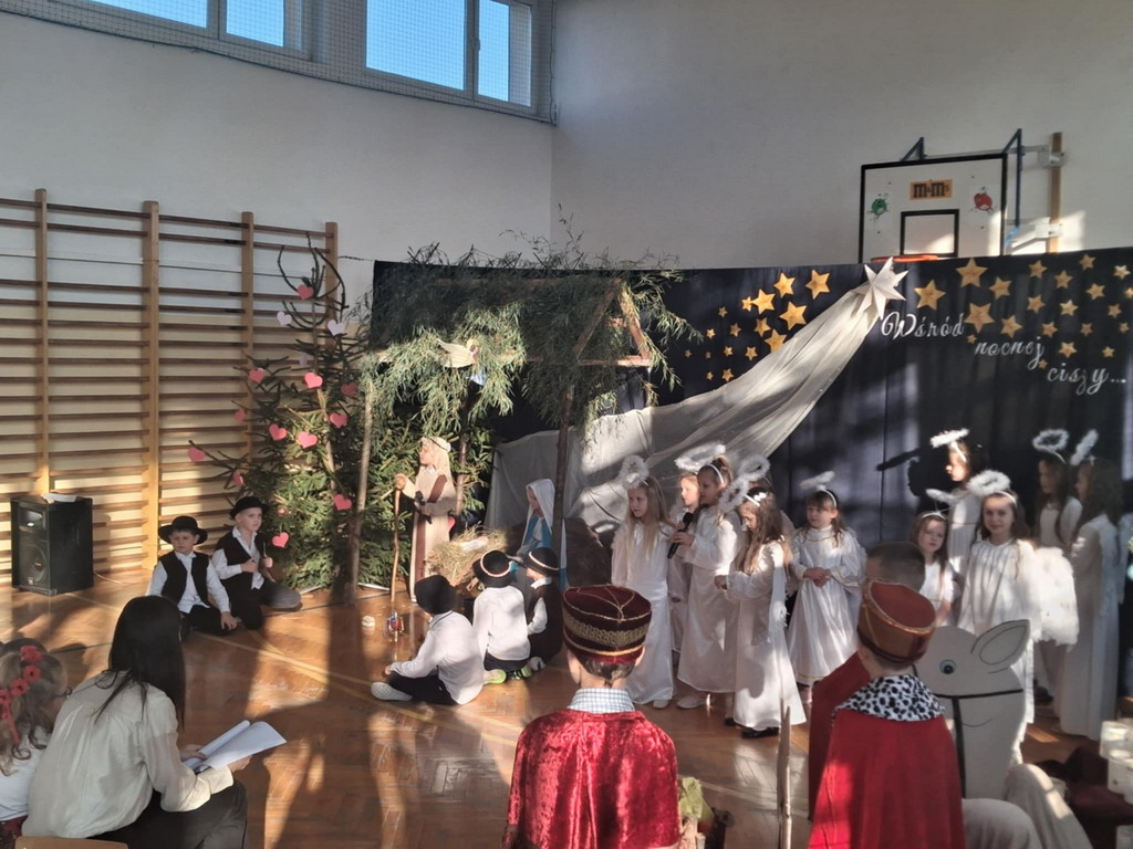 W dniu 19.12.2025r. w naszej szkole odbyła się uroczysta wigilia szkolna, pełna wzruszeń, radości i świątecznego ciepła. Dzieci z oddziału przedszkolnego oraz uczniowie klasy I przygotowali piękne przedstawienie bożonarodzeniowe, które wprowadziło wszystkich w magiczny, świąteczny nastrój. Po akademii wysłuchaliśmy koncertu kolęd w wykonaniu uczniów naszej szkoły, a następnie nadszedł wyjątkowy moment dzielenia się opłatkiem i składania życzeń.