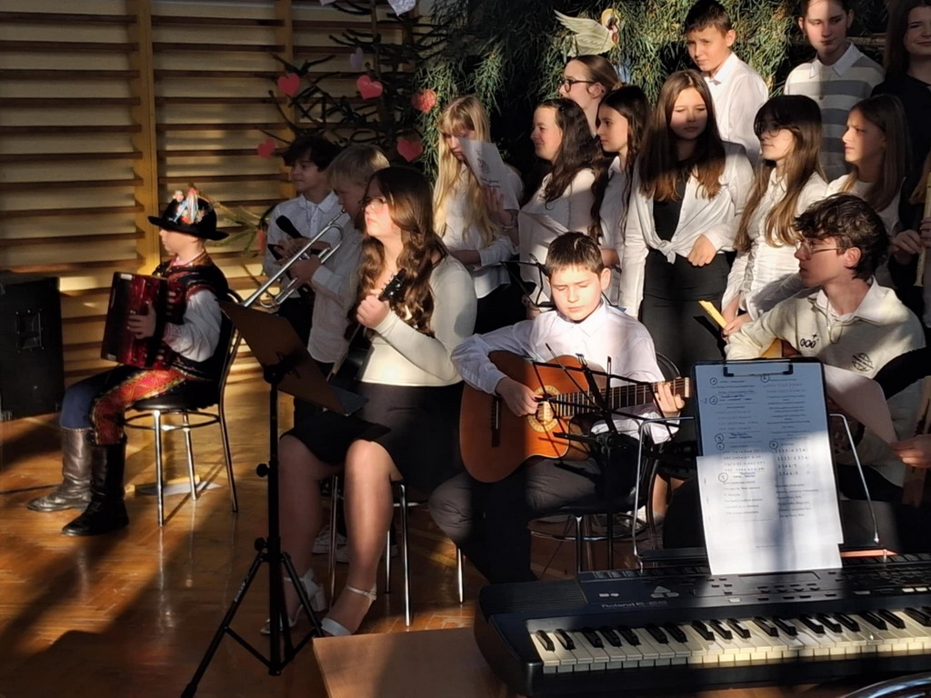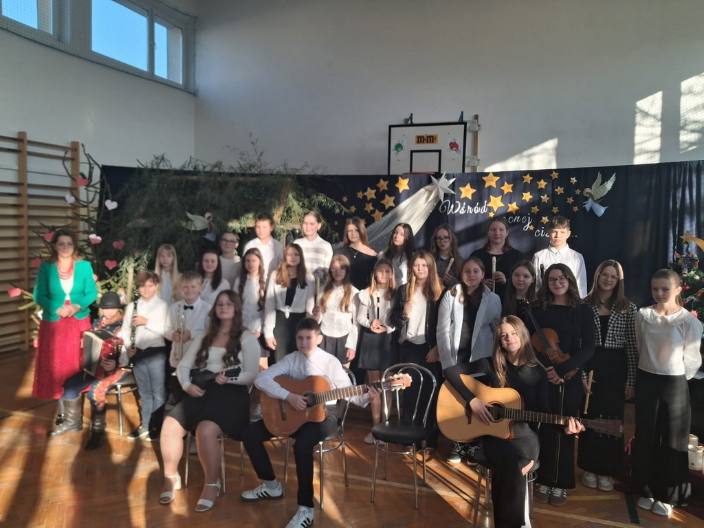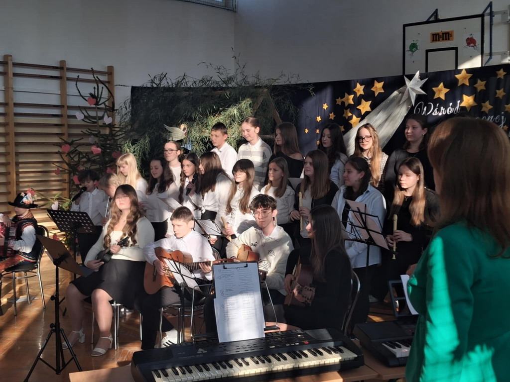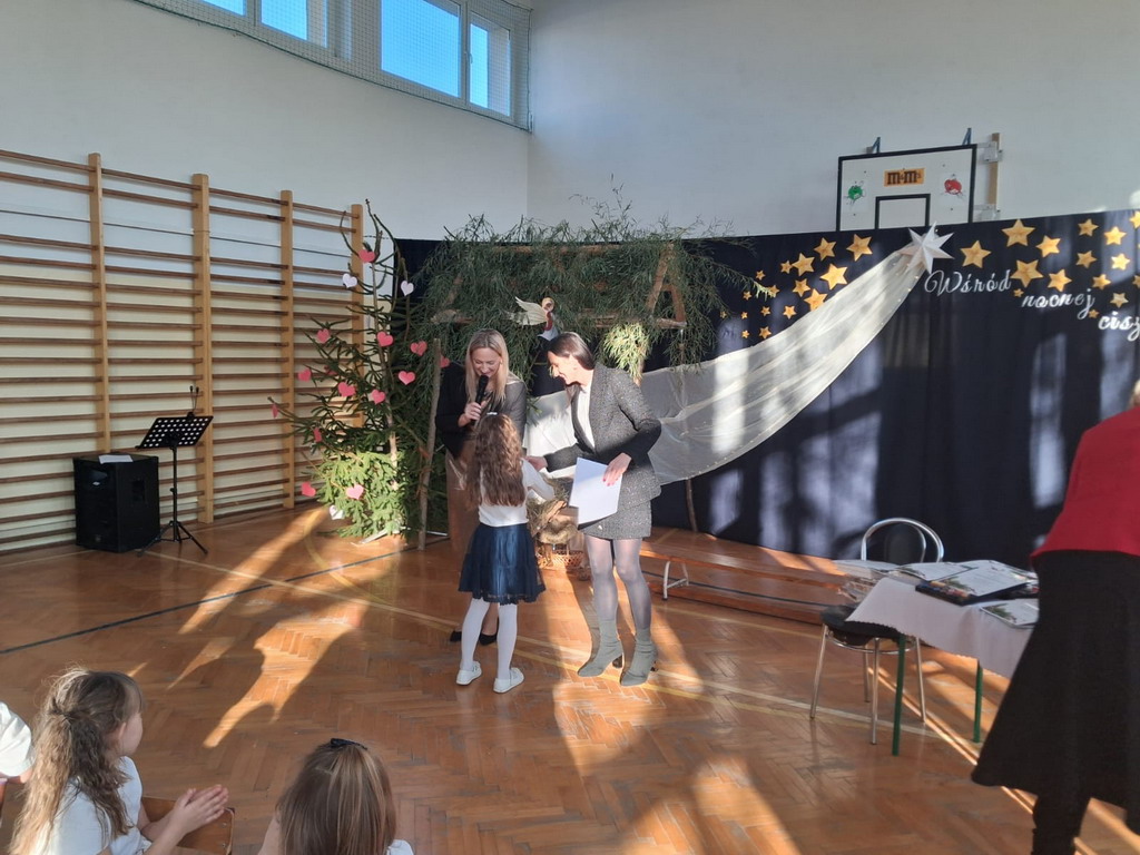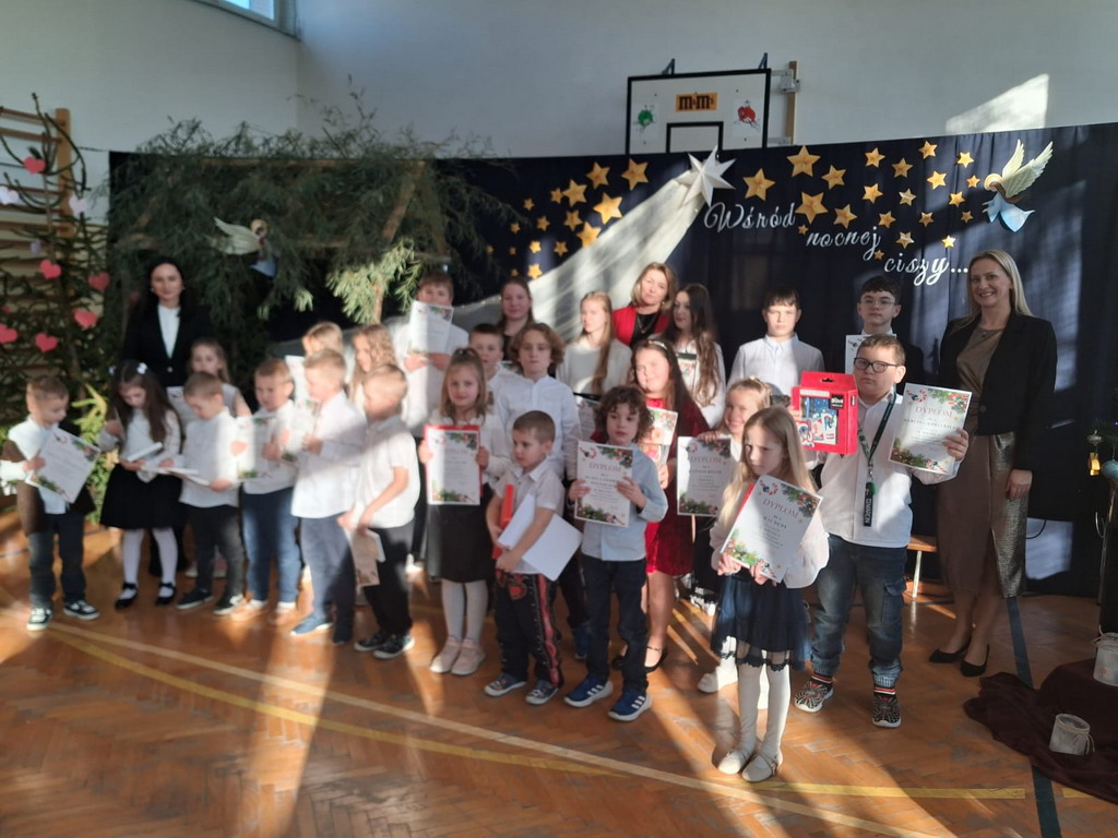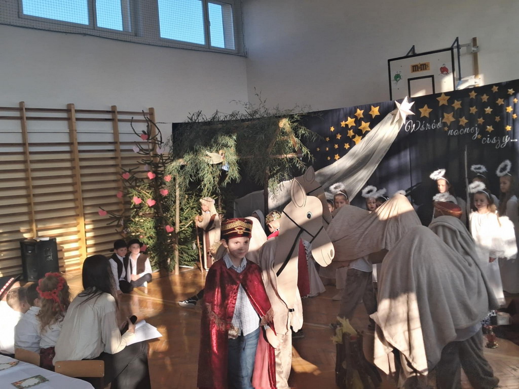 W dniu 19.12.2025r. w naszej szkole odbyła się uroczysta wigilia szkolna, pełna wzruszeń, radości i świątecznego ciepła. Dzieci z oddziału przedszkolnego oraz uczniowie klasy I przygotowali piękne przedstawienie bożonarodzeniowe, które wprowadziło wszystkich w magiczny, świąteczny nastrój. Po akademii wysłuchaliśmy koncertu kolęd w wykonaniu uczniów naszej szkoły, a następnie nadszedł wyjątkowy moment dzielenia się opłatkiem i składania życzeń.