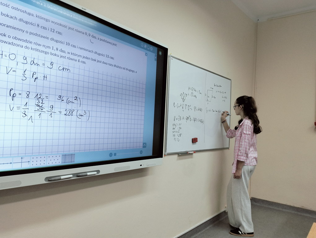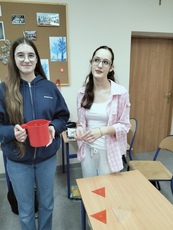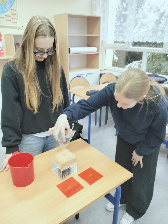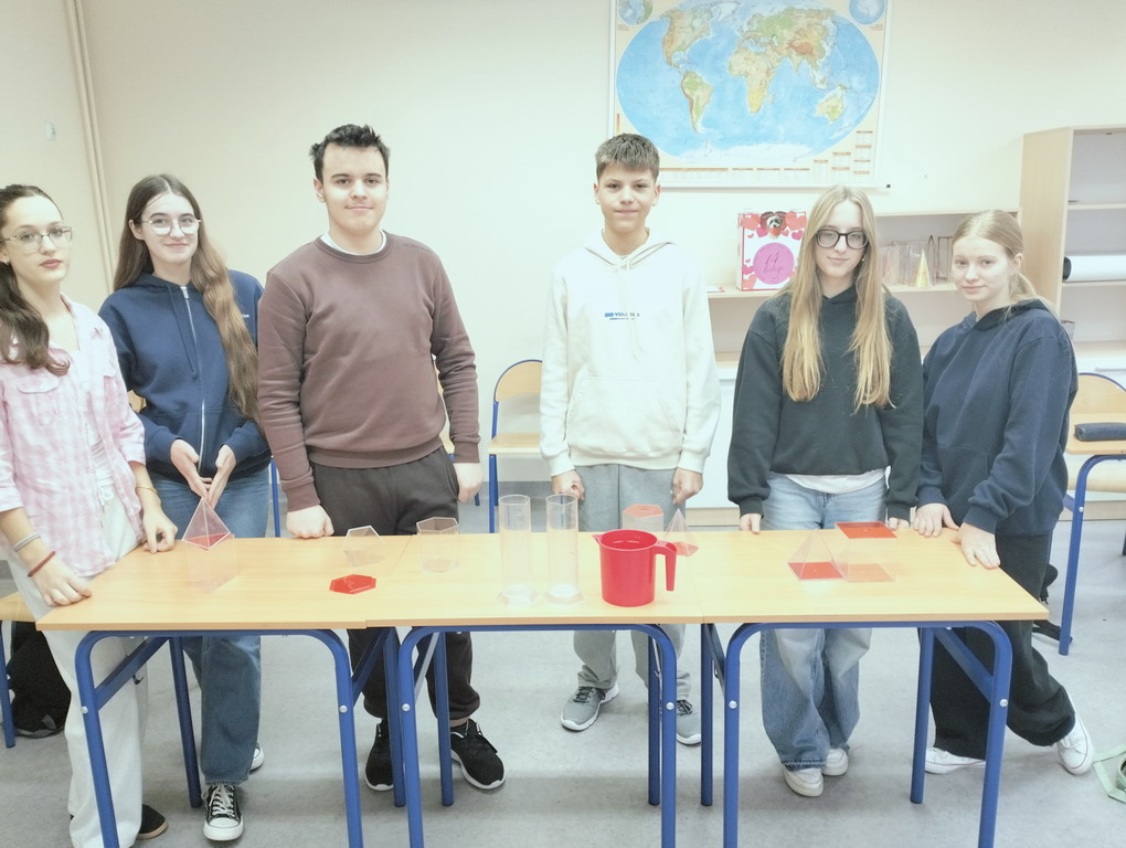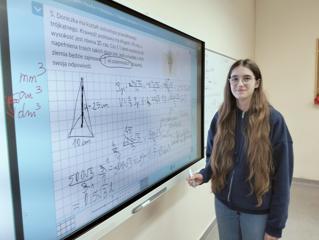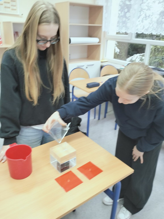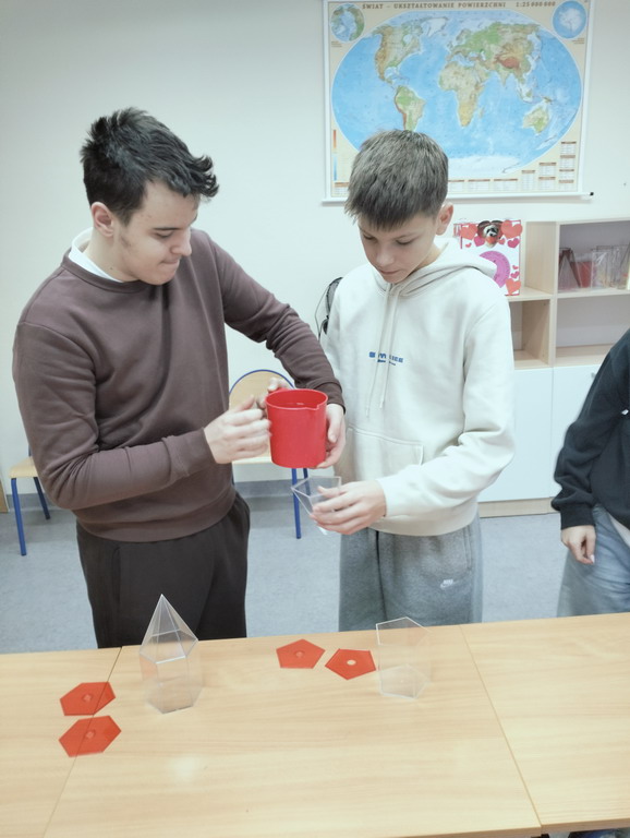 Na lekcji matematyki łączyliśmy teorię z praktyką - były obliczenia, eksperymenty z wodą i konkretne wnioski. Uczniowie sprawdzili, że objętość graniastosłupa jest 3 razy większa od objętości ostrosłupa o tej samej podstawie.