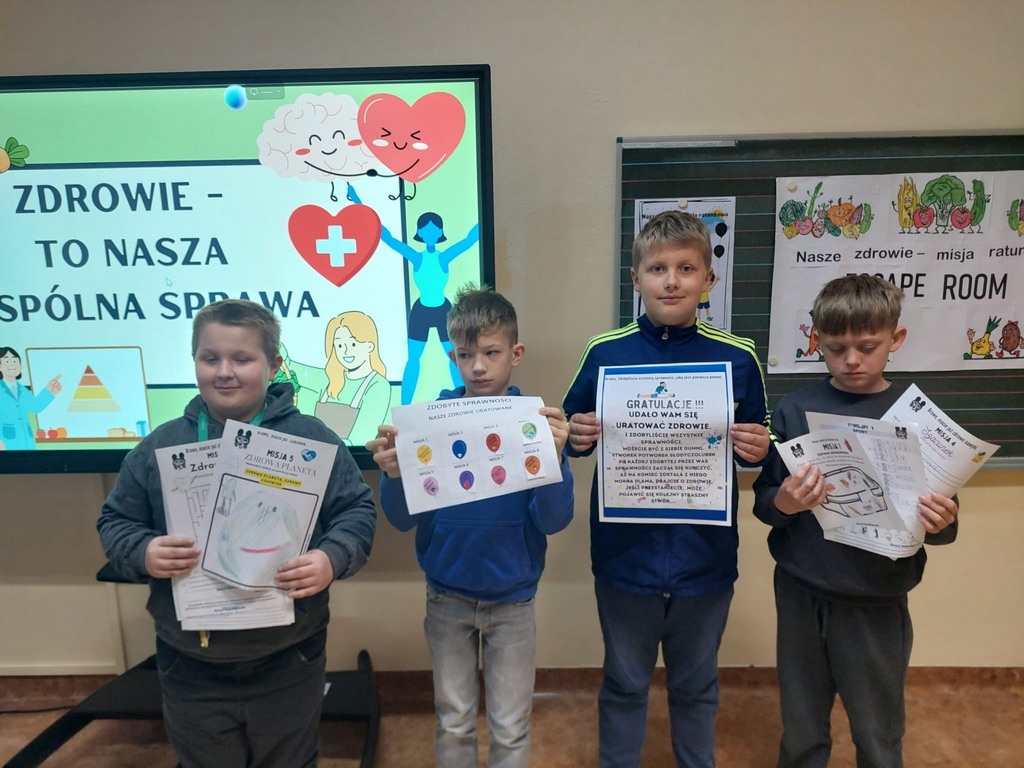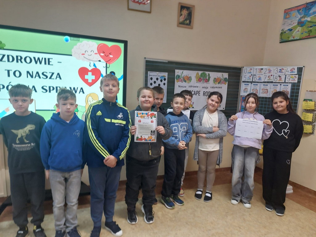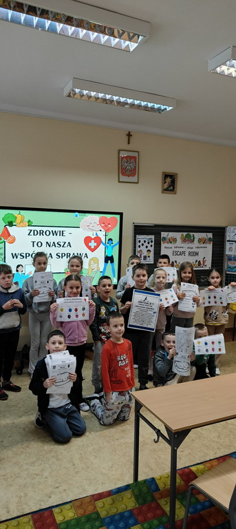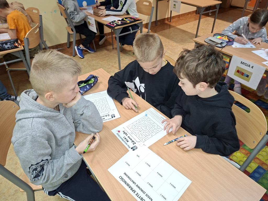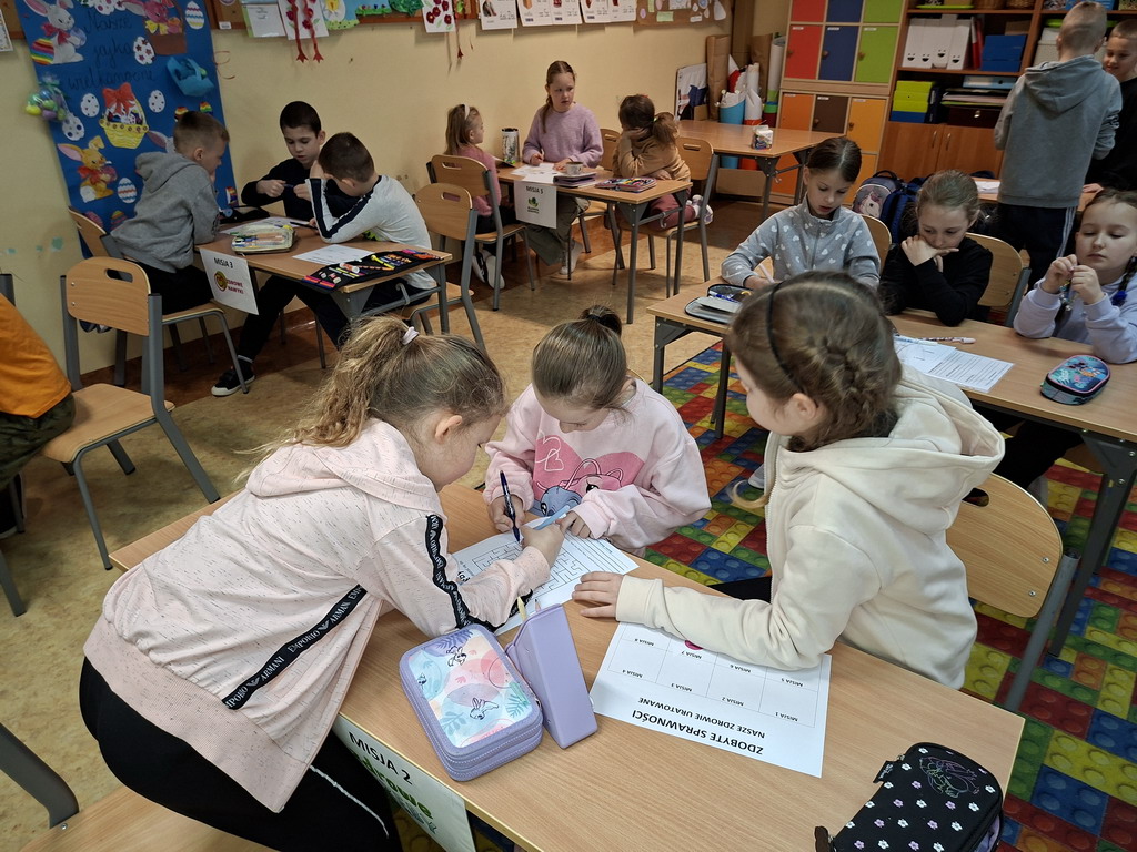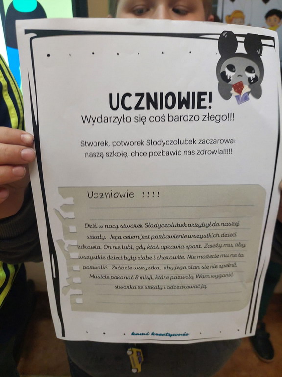 W Dniu 9 kwietnia uczniowie klas I-III wzięli udział w wyjątkowym escape roomie "Misja ratunkowa - Nasze zdrowie". Ich zadaniem było pokonanie potworka Słodyczolubka, który chciał pozbawić wszystkie dzieci zdrowia.